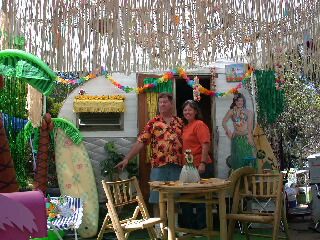 | If you choose to dress in theme for the Luau (and we hope you do!) The costumes don't have to be expensive or difficult. Almost everyone can find an old Hawaiian shirt or old style dress shoved back in their closet, and the look really adds to the theme and enjoyment of the Luau. 40's, 50's, 60's, 70's, all styles of dress contribute and are appreciated. So go wild or mild we'll love it! As always a best costume trophy will be given out at the Luau! |